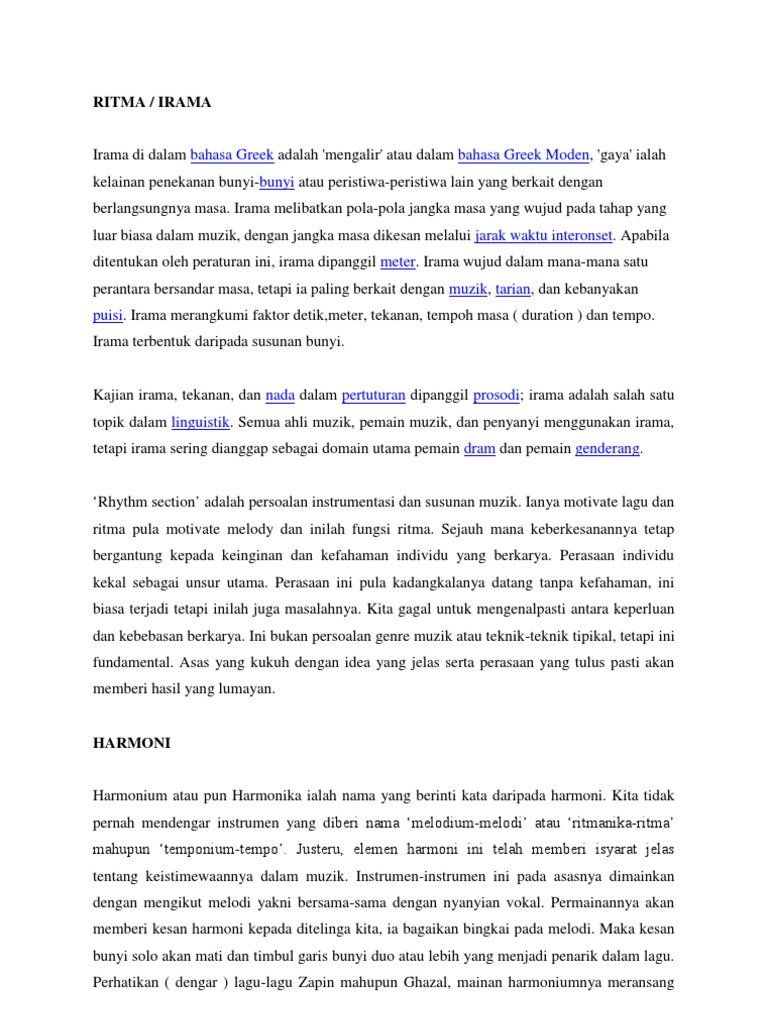 124 Harm oni Har moni adalah bunyi muzikal yang dihasilkan melalui kombinasi dua atau lebih not yang berbunyi serentak. Tempo biasanya diukur dalam ketukan setiap minit. 1Irama Irama merangkumi faktor detik meter tekanan tempoh masa duration dan tempo.